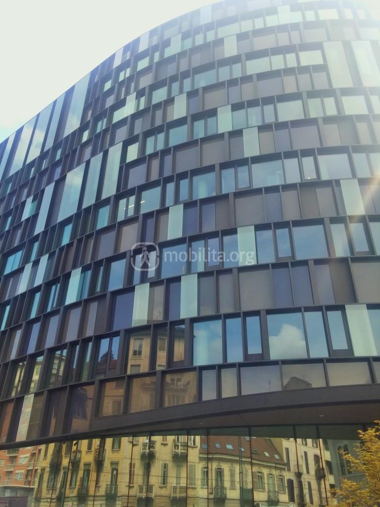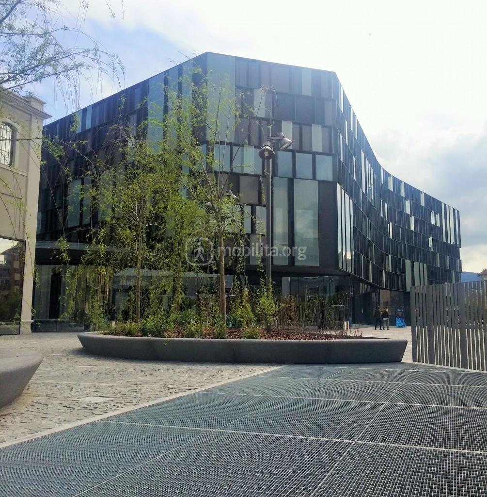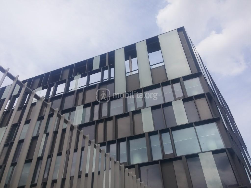 L’edificio per uffici, che comunica con la città attraverso un vasto atrio vetrato aperto su via Bologna e sulla nuova piazza verde, prende la forma di una grande “nuvola” che raccorda tra loro i vari fronti e gli edifici industriali conservati e convertiti a nuove funzioni. Il piano terra contiene funzioni in forte rapporto con il pubblico, affacciate su alcuni “giardini tematici” che creano un nuovo filtro verde tra edificio e città.