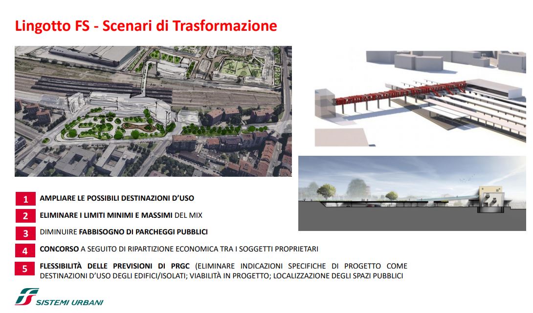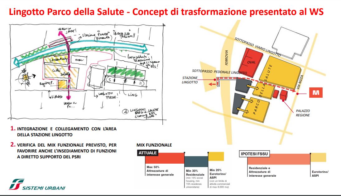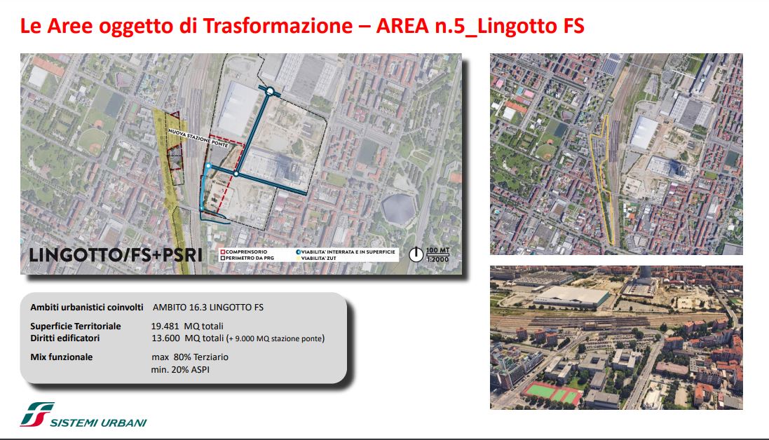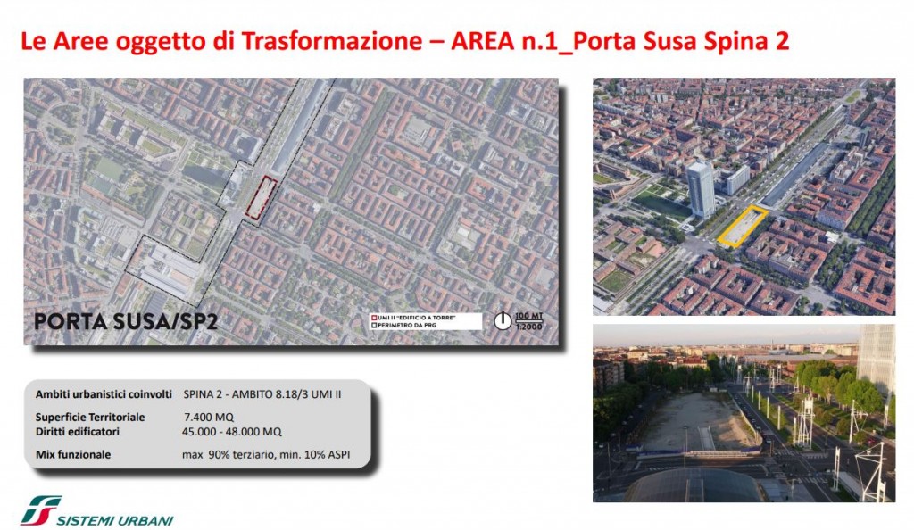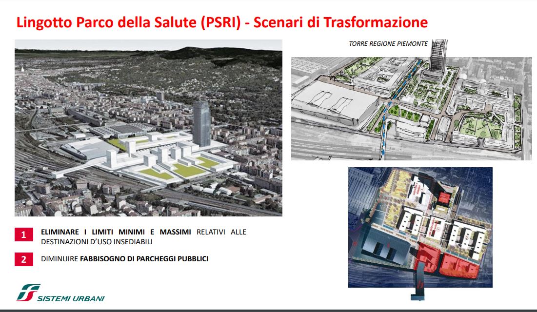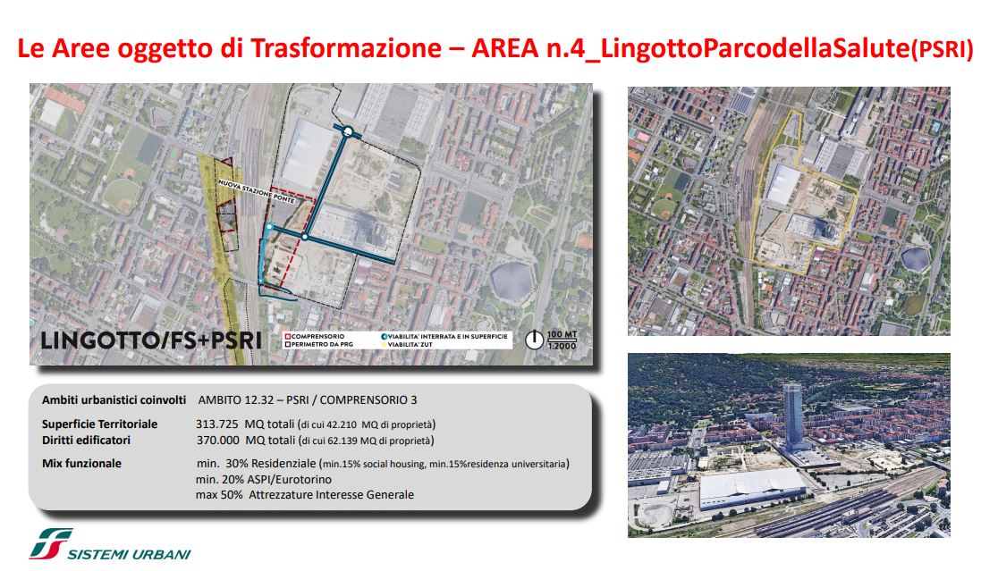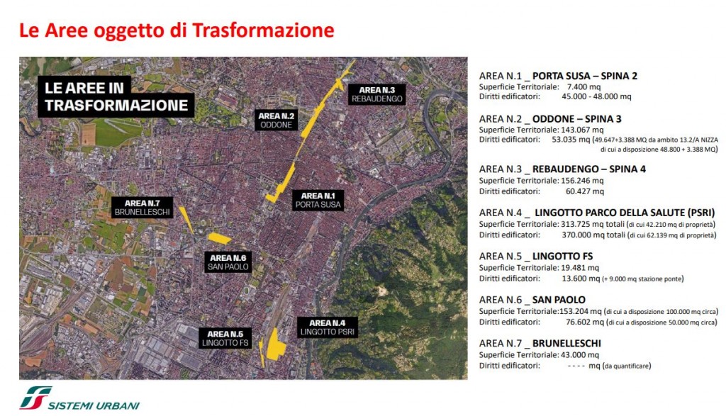 FS Sistemi Urbani (Gruppo FS Italiane) ha avviato, in collaborazione con la Città di Torino, un percorso per la riqualificazione e rigenerazione urbana di sette aree dismesse degli scali ferroviari, dei piazzali antistanti i magazzini di stazione e degli spazi strategici di proprietà delle società del Gruppo FS Italiane: il lotto Torre di Spina 2 nel contesto di Porta Susa, corso Oddone sulla Spina 3, la stazione Rebaudengo sulla Spina 4, il comprensorio Lingotto antistante il “Parco della Salute, Ricerca e Innovazione” e la torre della Regione Piemonte, l’area ferroviaria di Lingotto (Stazione ponte), lo scalo ferroviario di San Paolo e l’ambito Brunelleschi.