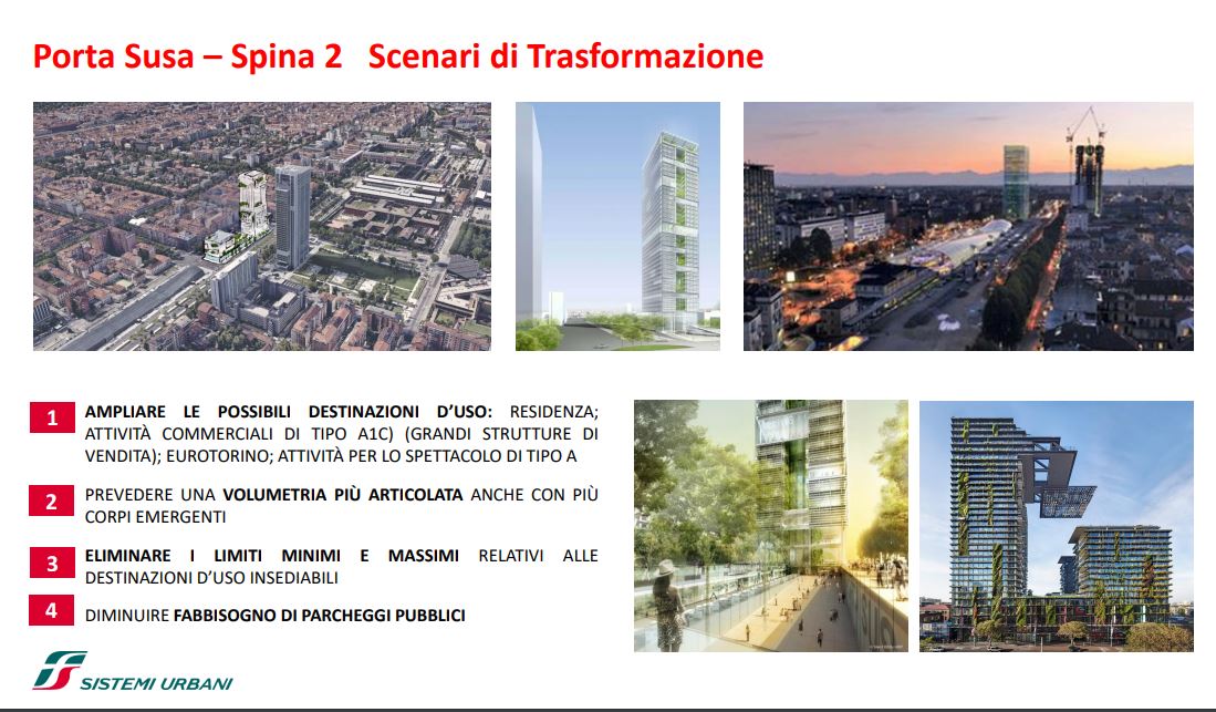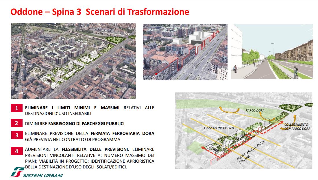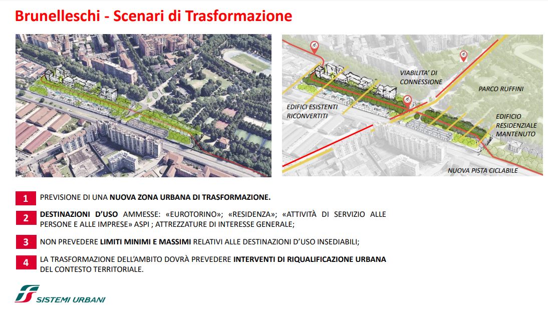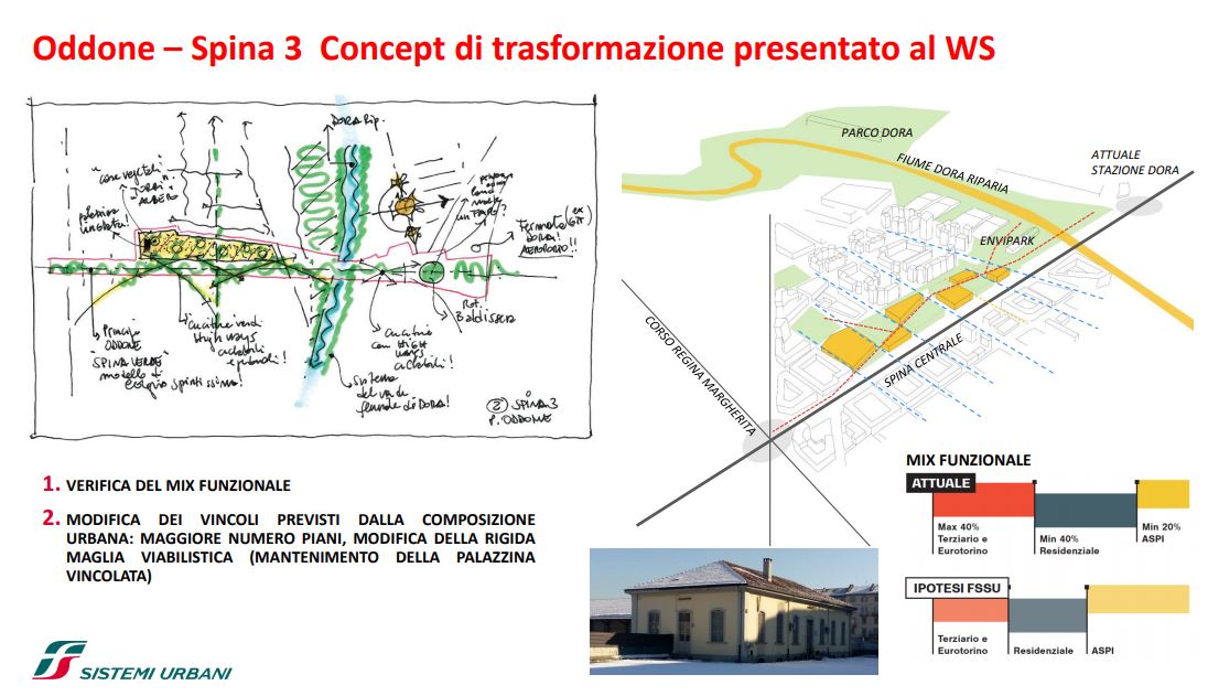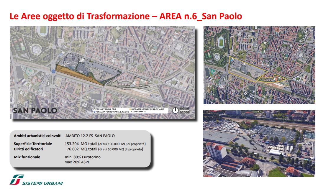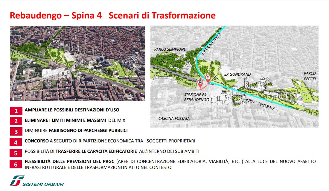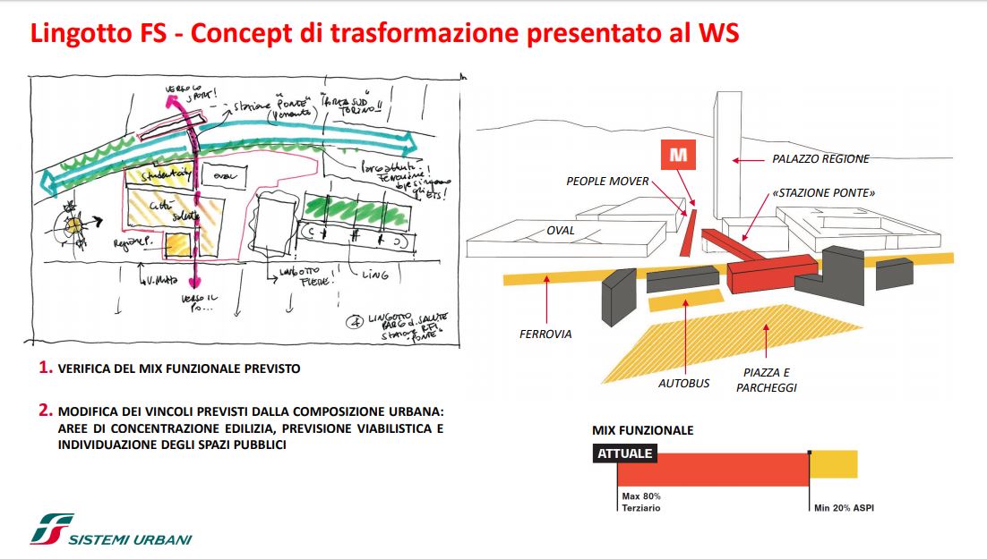 FS Sistemi Urbani (Gruppo FS Italiane) ha avviato, in collaborazione con la Città di Torino, un percorso per la riqualificazione e rigenerazione urbana di sette aree dismesse degli scali ferroviari, dei piazzali antistanti i magazzini di stazione e degli spazi strategici di proprietà delle società del Gruppo FS Italiane: il lotto Torre di Spina 2 nel contesto di Porta Susa, corso Oddone sulla Spina 3, la stazione Rebaudengo sulla Spina 4, il comprensorio Lingotto antistante il “Parco della Salute, Ricerca e Innovazione” e la torre della Regione Piemonte, l’area ferroviaria di Lingotto (Stazione ponte), lo scalo ferroviario di San Paolo e l’ambito Brunelleschi.
