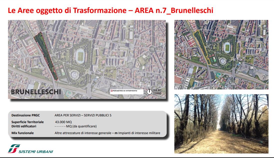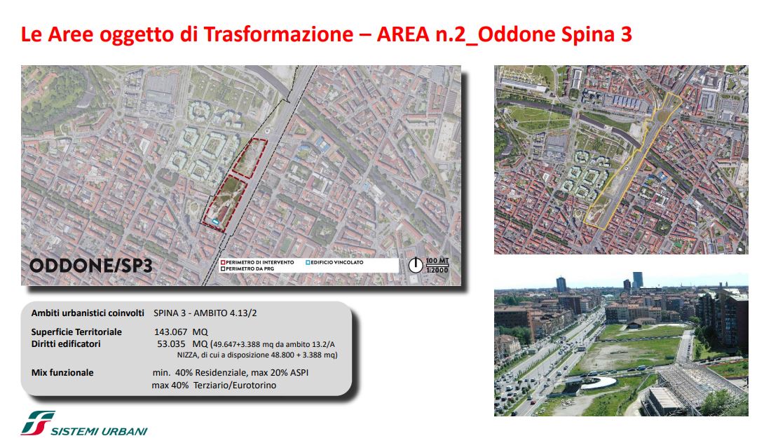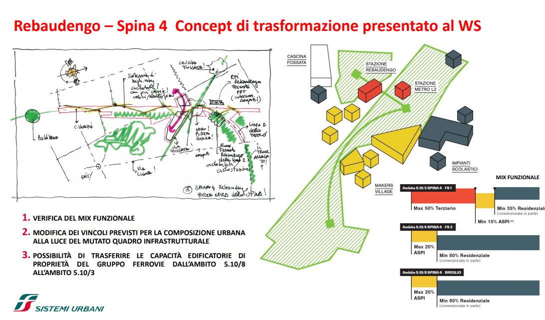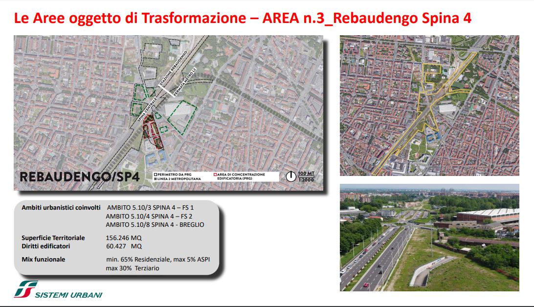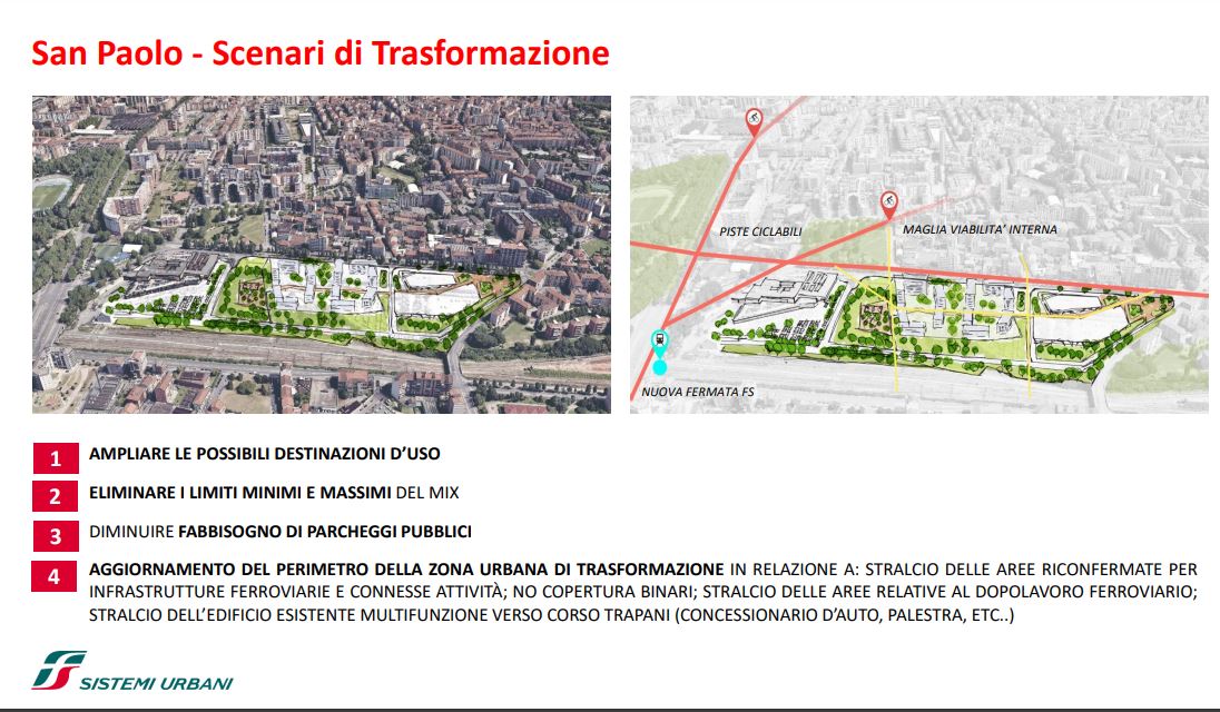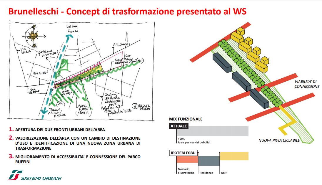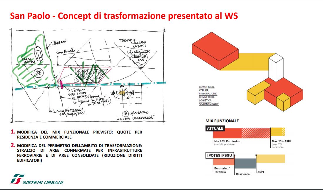 FS Sistemi Urbani (Gruppo FS Italiane) ha avviato, in collaborazione con la Città di Torino, un percorso per la riqualificazione e rigenerazione urbana di sette aree dismesse degli scali ferroviari, dei piazzali antistanti i magazzini di stazione e degli spazi strategici di proprietà delle società del Gruppo FS Italiane: il lotto Torre di Spina 2 nel contesto di Porta Susa, corso Oddone sulla Spina 3, la stazione Rebaudengo sulla Spina 4, il comprensorio Lingotto antistante il “Parco della Salute, Ricerca e Innovazione” e la torre della Regione Piemonte, l’area ferroviaria di Lingotto (Stazione ponte), lo scalo ferroviario di San Paolo e l’ambito Brunelleschi.