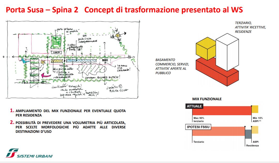 FS Sistemi Urbani è la società del Gruppo FS Italiane che si occupa della valorizzazione del patrimonio immobiliare non più funzionale alle attività ferroviarie con particolare attenzione alle stazioni, alle infrastrutture di trasporto, condividendone i progetti di rigenerazione con gli Enti locali. A Torino il dialogo avviato già a partire dai primi anni ’80, ha permesso di rispondere all’esigenza di allora, di potenziare il sistema ferroviario nel nodo locale consentendo di costruire l’asse viario del “Viale della Spina Centrale”, ricucendo intere zone e favorendo il recupero di aree industriali dismesse grazie all’interramento di oltre sette chilometri di linea